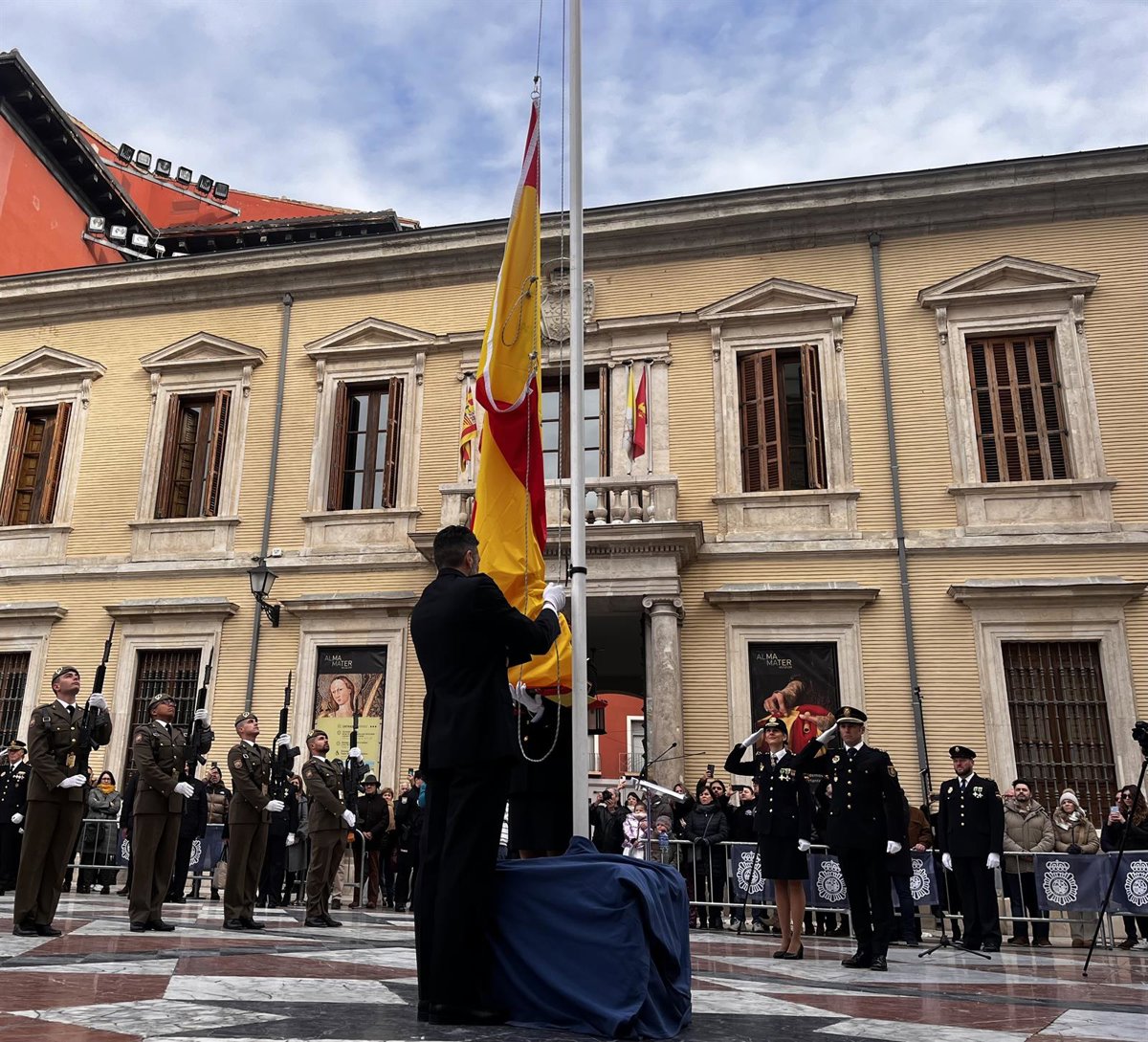 El izado de la bandera de España ha dado paso a la intervención del jefe superior de la Policía Nacional en Aragón, Florentino Marín, quien ha recordado los inicios del cuerpo, patrullando a pie, que ha evolucionado hasta emplear drones y "sumergirse en el ciberespacio".
