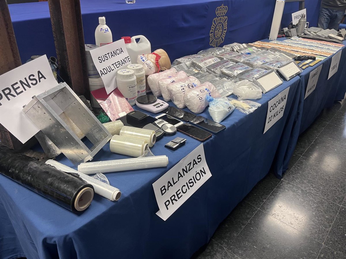 En total, se han incautado 22 kilos de cocaína, más de 7 kilos de sustancia adulterante, prensas mecánicas, 6.000 euros en efectivo, dos armas de fuego, munición, balanzas de precisión, útiles de preparación y manipulación y tres vehículos.