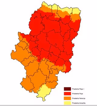 En concreto, existe un alto riesgo de incendio (prealerta roja) en la mayor parte de la mitad norte de la Comunidad, siendo moderado (prealerta naranja) en el resto, excepto en el extremo norte y ciertas áreas de la provincia de Teruel, donde es bajo (prealerta amarilla).