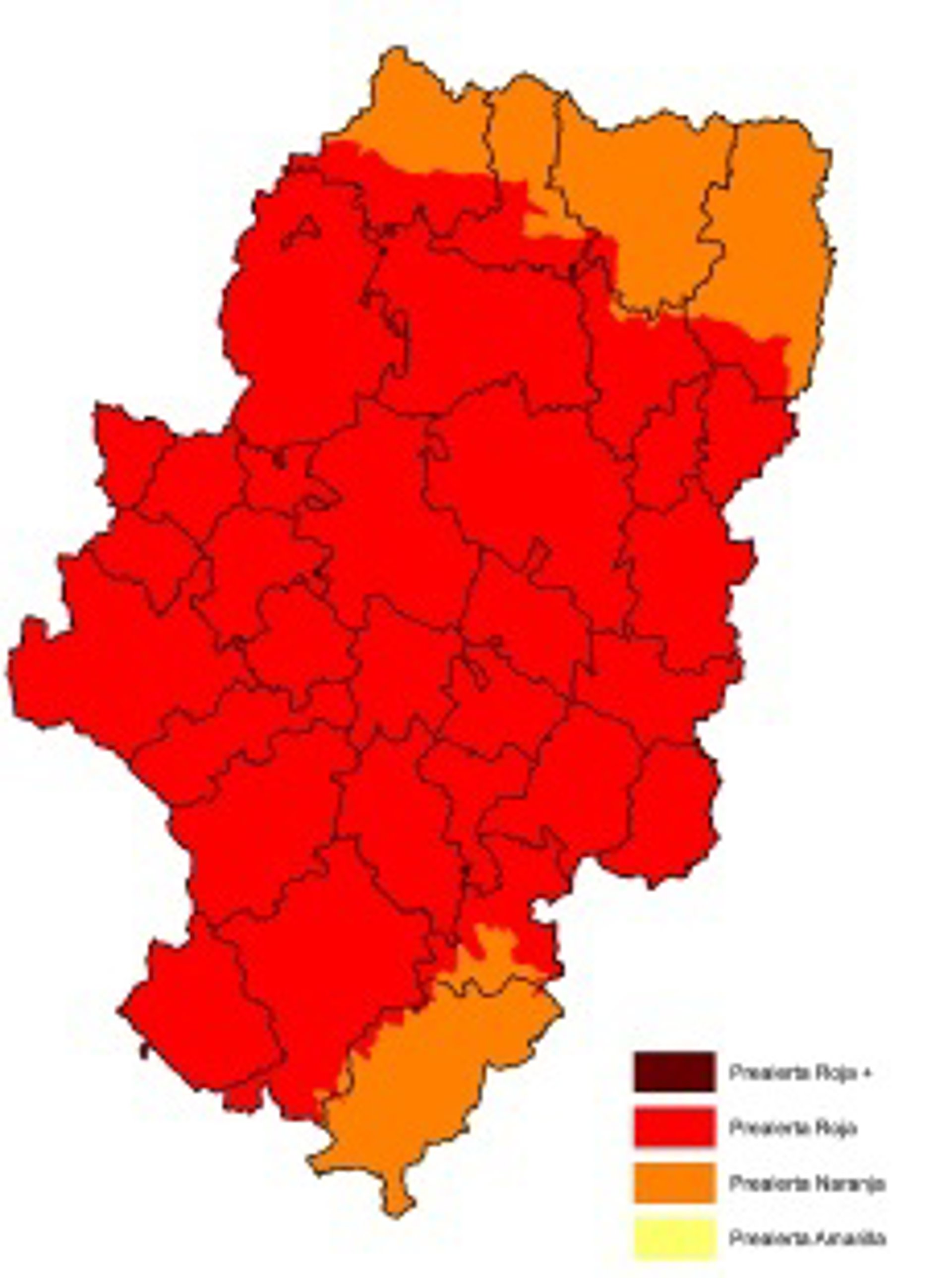 Existe un alto riesgo de incendio (prealerta roja) en la mayor parte de Aragón, presentando un riesgo moderado (naranja) solo en algunas zonas del extremo norte y sureste de la región, ha detallado el Ejecutivo aragonés en una nota de prensa.