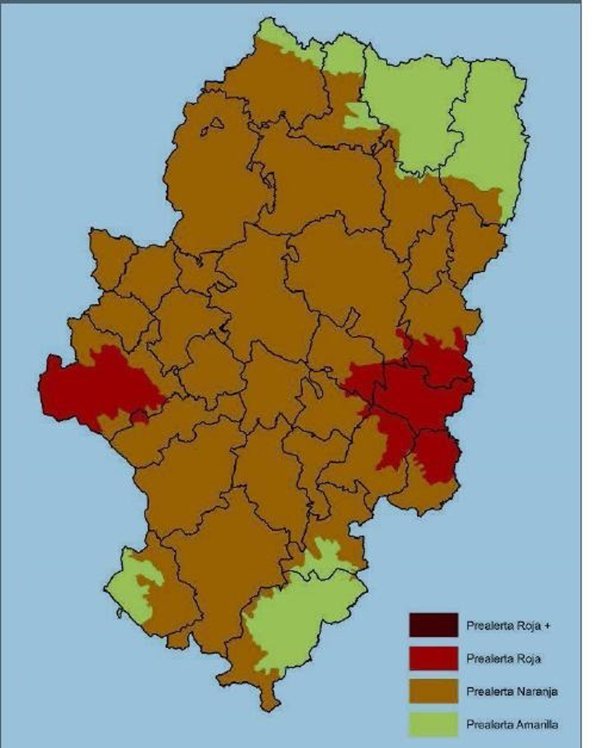En la mayor parte del resto de la Comunidad el riesgo es moderado (prealerta naranja). Solo hay riesgo bajo en algunas comarcas del nordeste y sur de la región.