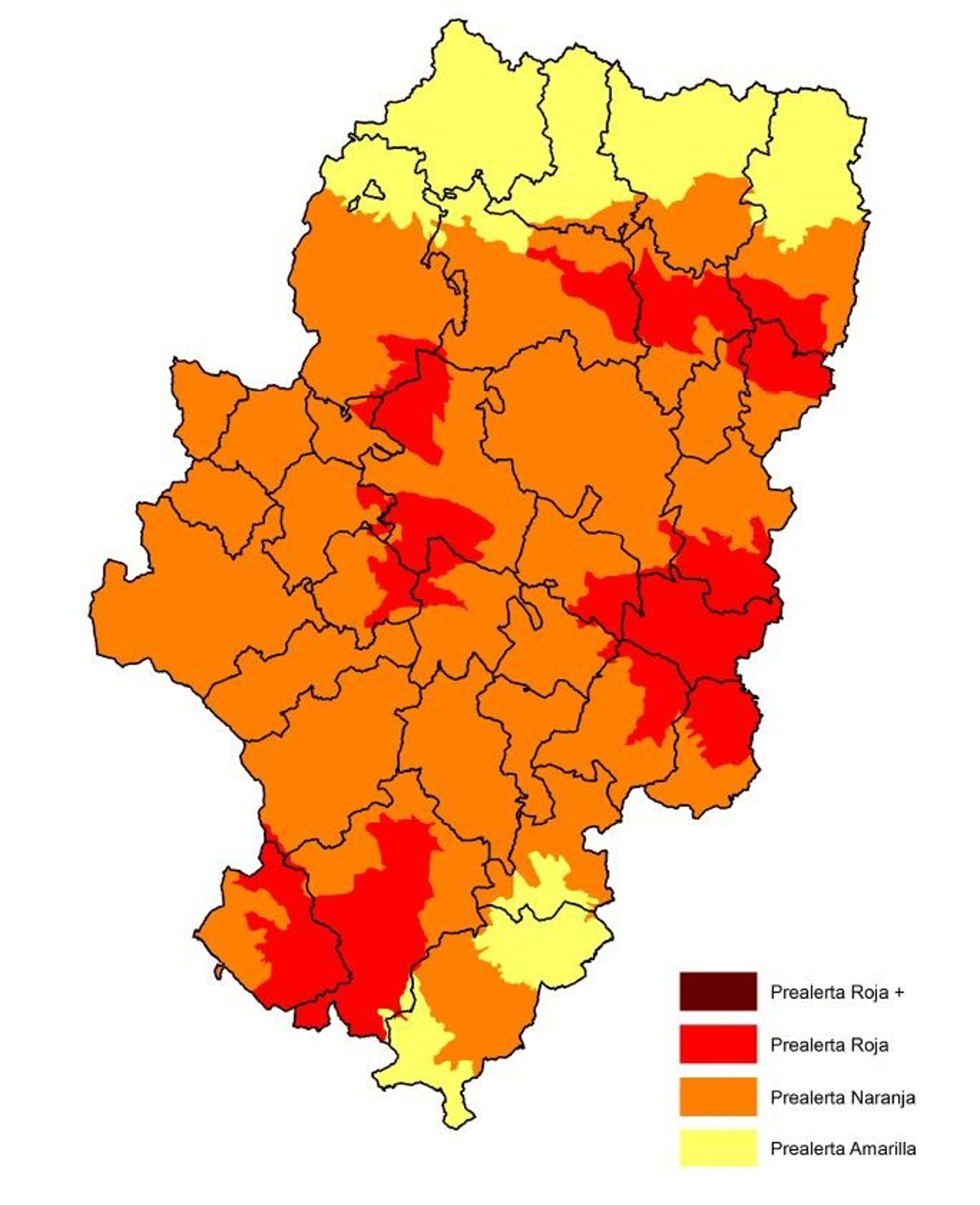 En concreto, existe un alto riesgo de incendios en el Bajo Ebro, Valmadrid, Zuera, Somontano Oriental, Rodeno y Turia. Además, el riesgo es moderado (prealerta naranja) en la mayor parte del resto de Aragón y bajo (prealerta amarilla) en Gúdar, Javalambre y en el Pirineo.