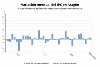 El Índice de Precios de Consumo (IPC) se ha incrementado en Aragón en septiembre respecto al mes anterior el 0,3 por ciento, mientras que la variación interanual es del 2,3, según los datos publicados este jueves por el Instituto Nacional de Estadística (INE).