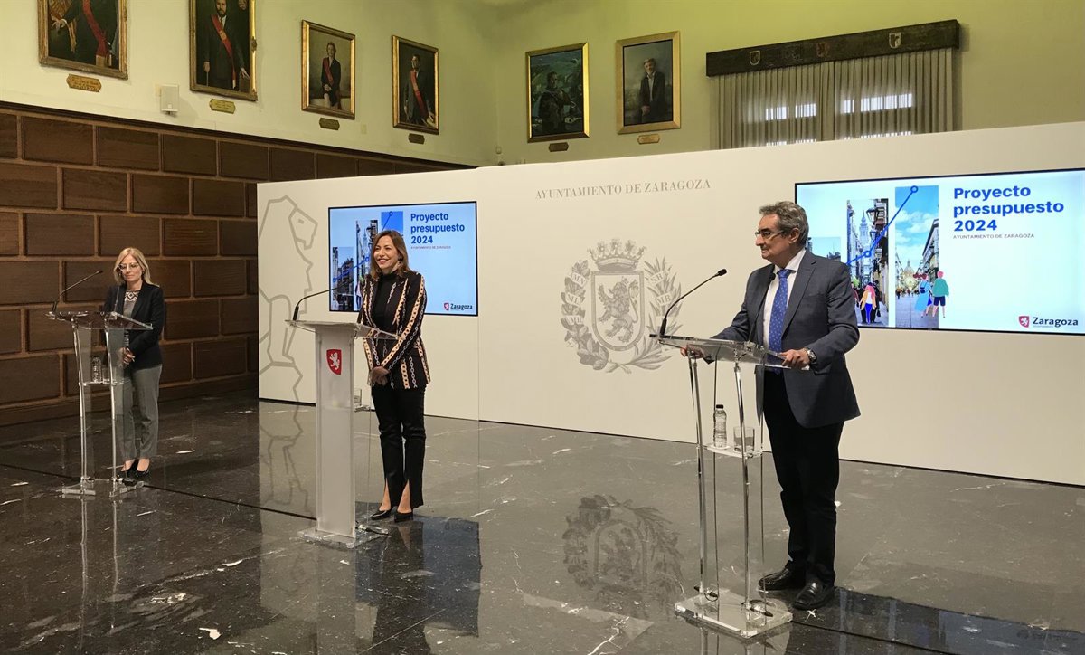 La alcaldesa de Zaragoza, Natalia Chueca; junto a la consejera municipal de Hacienda, Blanca Solans; y el portavoz de VOX, Julio Calvo, han presentado el proyecto de presupuestos en rueda de prensa. La previsión es que superado el trámite de enmiendas y exposición publica se pueda aprobar en febrero para su posterior ejecución.