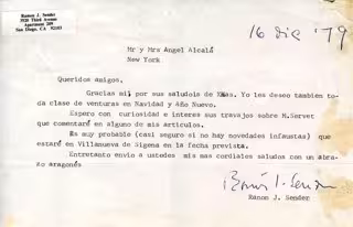 En aquellos meses, por mediación del profesor Alcalá, el Instituto de Estudios Sijenenses invitó a Ramón J. Sender para hablar de Miguel Servet en su lugar natal, Villanueva de Sijena. Sender había expresado en diferentes momentos una honda simpatía por Servet, a propósito de quien escribía en una de sus cartas que "Aragón ha tenido muchos religiosos de fondo, alerta y tendencia inteligentemente anticlerical".
