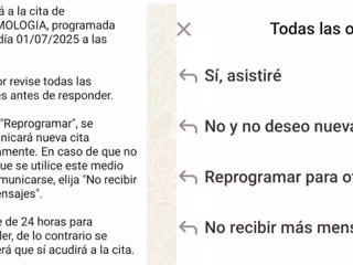 Cinco días antes de la cita con el especialista, el paciente recibe un mensaje de WhatsApp en su teléfono móvil desde un número verificado del Servicio Aragonés de Salud. Puede responder con "SI" para confirmar la cita, "NO" para cancelarla o "REPROGRAMAR" para solicitar una nueva fecha.
