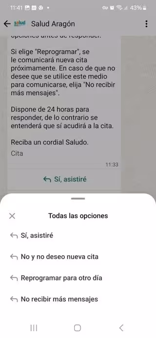 En el mensaje que recibe el usuario, tras un saludo y presentación desde el Servicio Aragonés de Salud y el centro sanitario en el que tiene la cita, se le pregunta si acudirá a la cita fijada determinado día, a determinada hora.