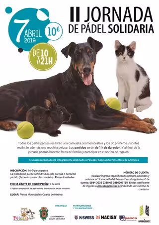 La asociación protectora de animales Pelusas organiza la segunda Jornada solidaria de Pádel, que tendrá lugar este domingo, día 7 de abril, en las pistas municipales de la localidad zaragozana de Cuarte de Huerva.