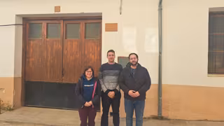 El alcalde de La Iglesuela del Cid, Fernando Safont, en el centro, flanqueado por los diputados autonómicos Mari Carmen Soler y Ángel Peralta frente al edificio que se quería reformar para albergar la escuela de Protección Civil. - PSOE TERUEL