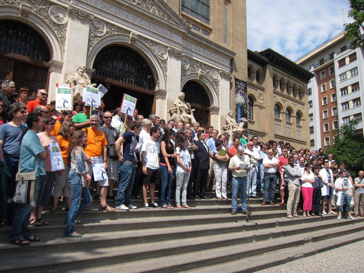 El rectorado de la UZ se ha sumado este viernes a la concentración en defensa de la investigación que han convocado los sindicatos Comisiones Obreras y UGT, en el edificio Paraninfo. El acto, que ha concluido con la lectura de un manifiesto, se une a los organizados por el Colectivo 'Carta por la Ciencia' en todo el país en contra de los recortes en Investigación, Desarrollo e Innovación (I+D+i).