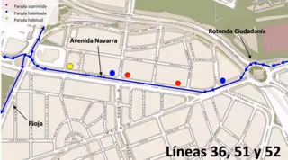 Las líneas del Consorcio de Transportes girarán en la glorieta de la calle Rioja y circularán por avenida Ciudad de Soria hacia plaza de la Ciudadanía. Se habilitarán paradas provisionales para la bajada de viajeros en avenida Navarra 141, junto al IES Santiago Hernández; en la calle Rioja frente al Centro de Especialidades Médicas Inocencio Jiménez; y junto al cruce de la avenida Ciudad de Soria con la calle Juan XXIII.