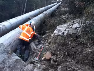 Los primeros trabajos que ya están en marcha son los de la reparación del apoyo de hormigón y el desescombro de los restos de la roca. Por su parte, se están ya construyendo las piezas para reparar la grieta en la tubería y la parte afectada de la pasarela.