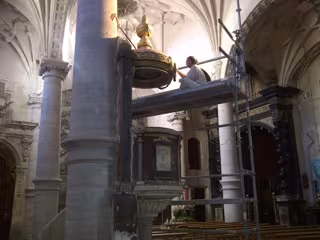 Además, también está restaurando el púlpito construido en la nave central de la iglesia en el año 1799, realizado en yeso con decoraciones en relieve y policromía, se ha puesto en marcha una limpieza general, eliminando los elementos que no son originales, consolidando y fijando los elementos degradados o que presenten riesgo de desprendimiento, y restaurando los yesos moldurados y las policromías siguiendo las texturas y colores originales.