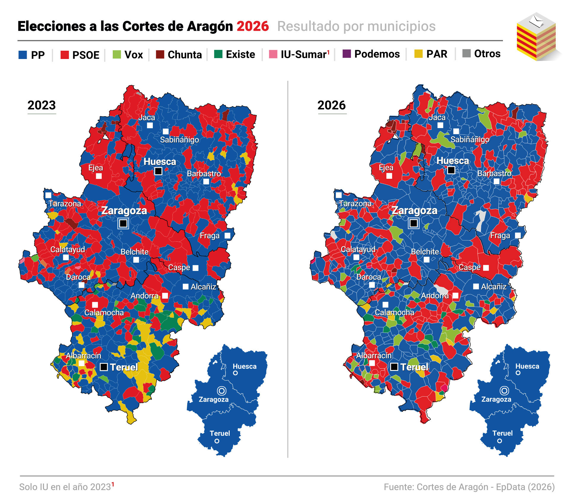 En estas elecciones se produce ampliación del dominio territorial del PP, mientras que el PSOE mantiene el liderazgo en municipios clave como Ejea (Zaragoza) o Andorra (Teruel). El Partido Aragonés pierde la primera posición en buena parte del territorio. Entre los cambios más destacados, deja de ser la fuerza más votada en Albarracín.