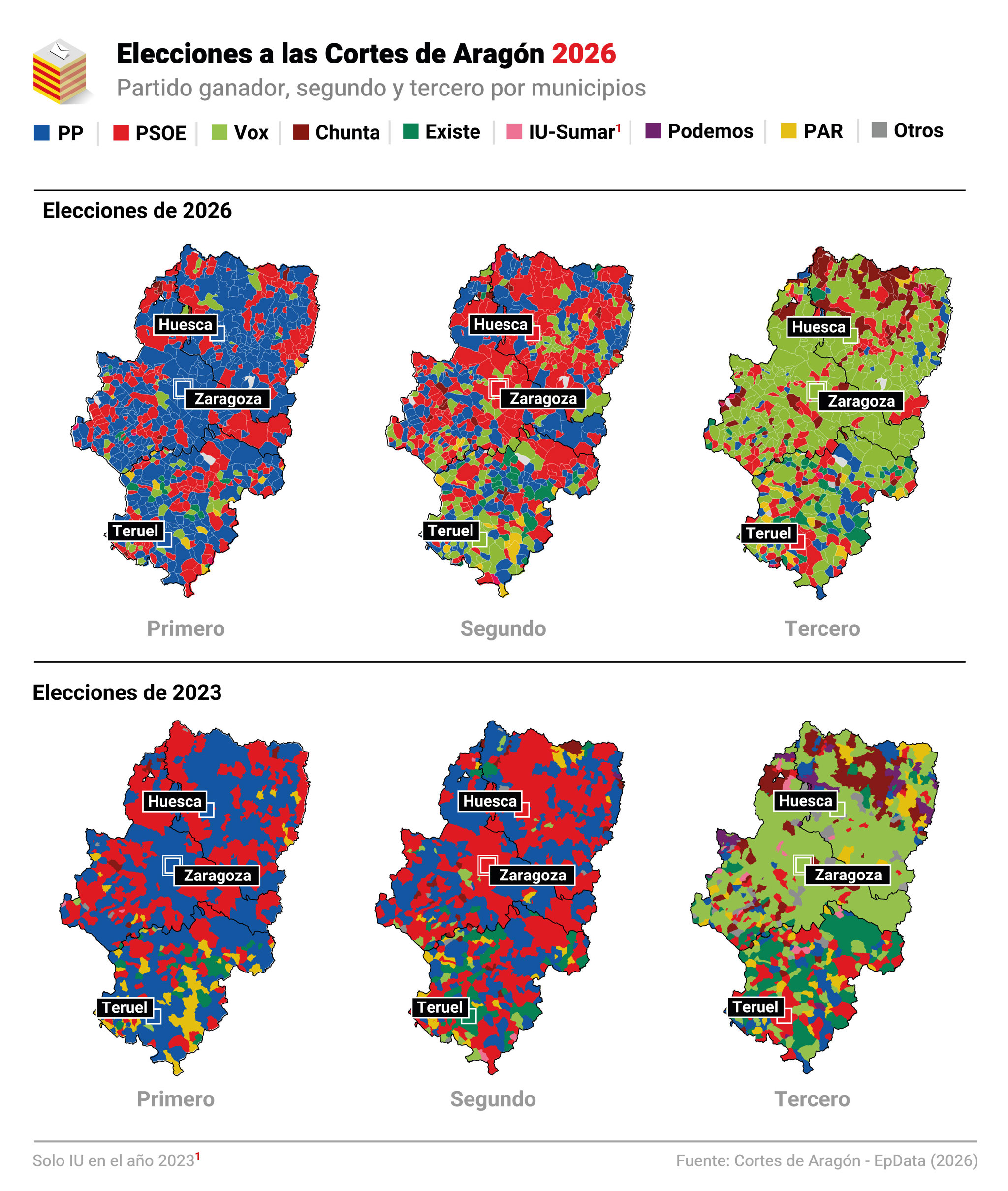 Por otro lado, el PP es la primera fuerza en Zaragoza, Huesca y Teruel, igual que en 2023, mientras el PSOE mantiene la segunda posición en Zaragoza y Huesca. En la capital turolense, Vox pasa a ocupar el segundo puesto y el PSOE queda como tercera fuerza.