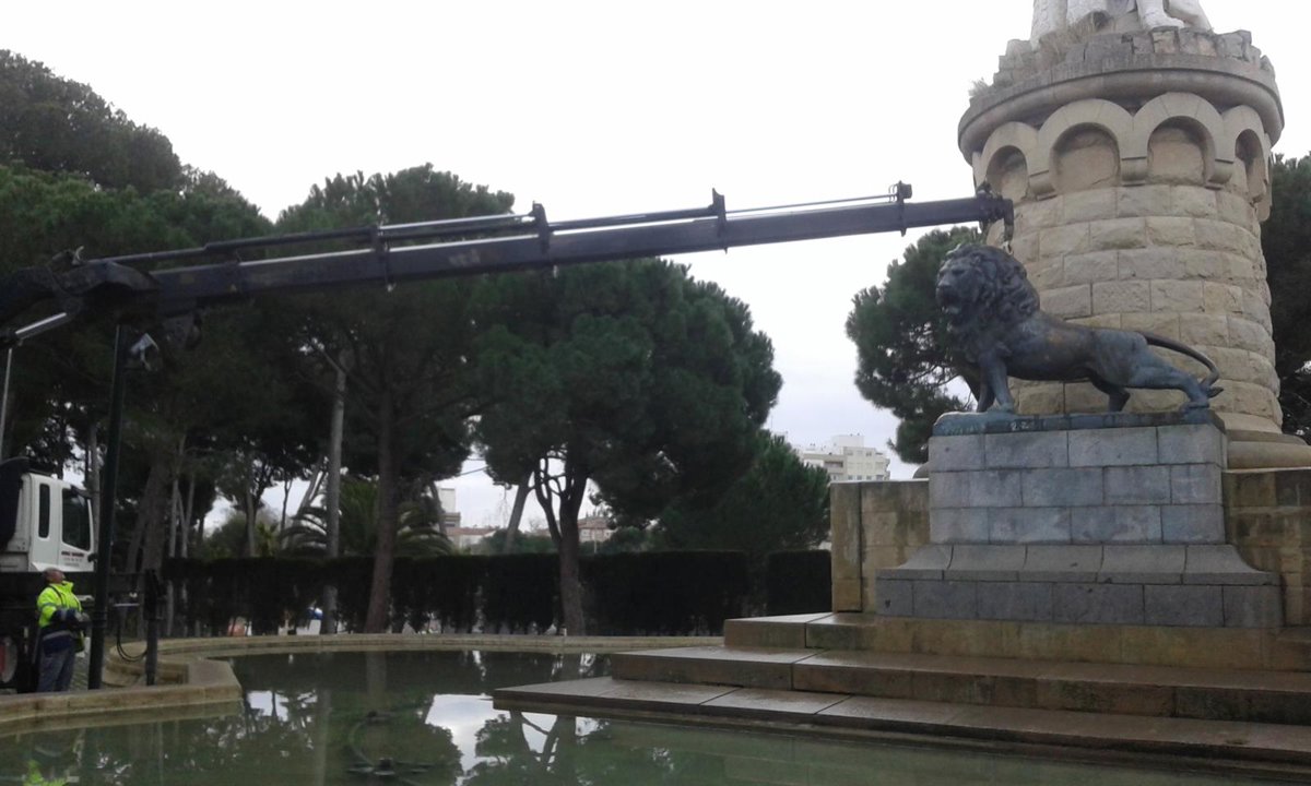 El Ayuntamiento de Zaragoza ha procedido este martes a la retirada este martes el león de bronce del monumento al rey Alfonso I 'El Batallador', situado en el Parque 'José Antonio Labordeta'. La escultura se encuentra muy deteriorada y se va a proceder a su limpieza y restauración.