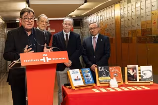 De izquierda a derecha: el director del Instituto Cervantes, Luis García Montero; el diplomático y exembajador de España en México, Emilio Cassinello; el fundador y director de la revista Turia, Raúl Carlos Maícas y el presidente de la DPT, Joaquín Juste - INSTITUTO CERVANTES/VALENTINA DELUCA