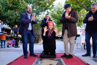 La periodista Rosa María Calaf tras estampar este domingo sus manos en el espacio reservado a su figura en el Paseo de las Estrellas de Cariñena (Zaragoza). - AYUNTAMIENTO DE CARIÑENA