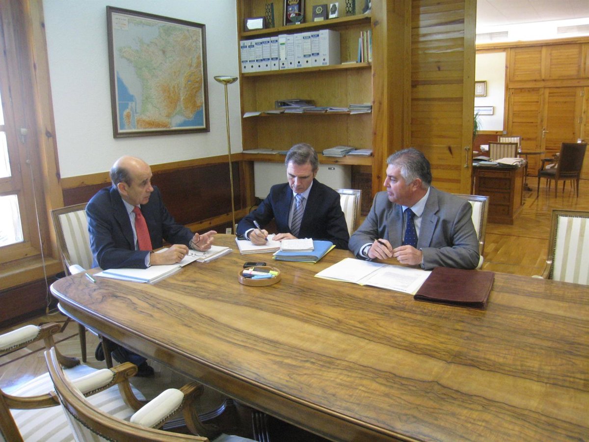 El consejero de Obras Públicas, Urbanismo, Vivienda y Transportes del Gobierno de Aragón, Rafael Fernández de Alarcón, acompañado por el director general de Transportes del Gobierno de Aragón, Jesús Díez, y por el director general de Comercio y Artesanía, Juan Carlos Trillo, como representantes del Ejecutivo autónomo en la Sociedad de Promoción del Aeropuerto de Zaragoza (PAZ) ha mantenido este martes un nuevo encuentro con Ryanair, en el marco del calendario de actuaciones diseñado el pasado mes de julio para continuar con la presencia de esta compañía que presta su servicio en el aeropuerto zaragozano.