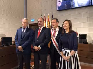 El presidente de la DPZ, Juan Antonio Sánchez Quero, junto al presidente de las Cortes, Javier Sada, el presidente en funciones de Aragón, Javier Lambán, y la delegada del Gobierno en funciones, Carmen Sánchez, tras ser reelegido este lunes en el cargo. - EUROPA PRESS