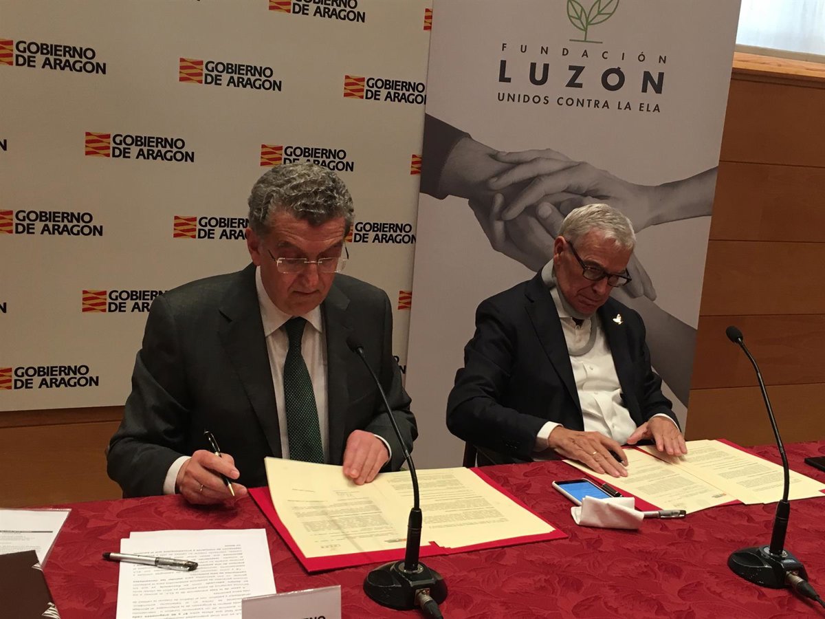 El consejero de Sanidad del Gobierno de Aragón, Sebastián Celaya, y el presidente de la Fundación Francisco Luzón Unidos contra la ELA, Francisco Luzón, han suscrito este martes un convenio marco para impulsar la investigación sobre la esclerosis lateral amiotrófica (ELA) y mejorar la calidad de vida de los pacientes aquejados por esta enfermedad.