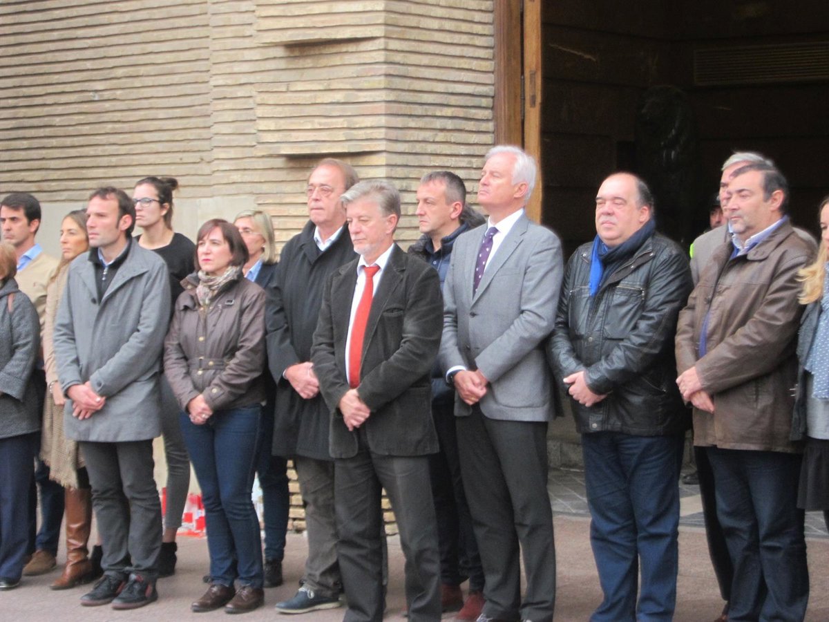 Santisteve, junto al equipo de gobierno y los portavoces de los grupos municipales del Ayuntamiento de Zaragoza, además de numerosos concejales ha participado en una concentración ante las puertas del Consistorio a la que se han sumado varias decenas de ciudadanos para expresar el rechazo a los atentados sufridos en la capital francesa el pasado viernes en el que han fallecido 132 personas y más de 300 han resultado heridas.