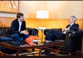 El presidente del Gobierno de Aragón, Jorge Azcón, se entrevista con el diputado de IU, Álvaro Sanz, en el Edificio Pignatelli. - IU.