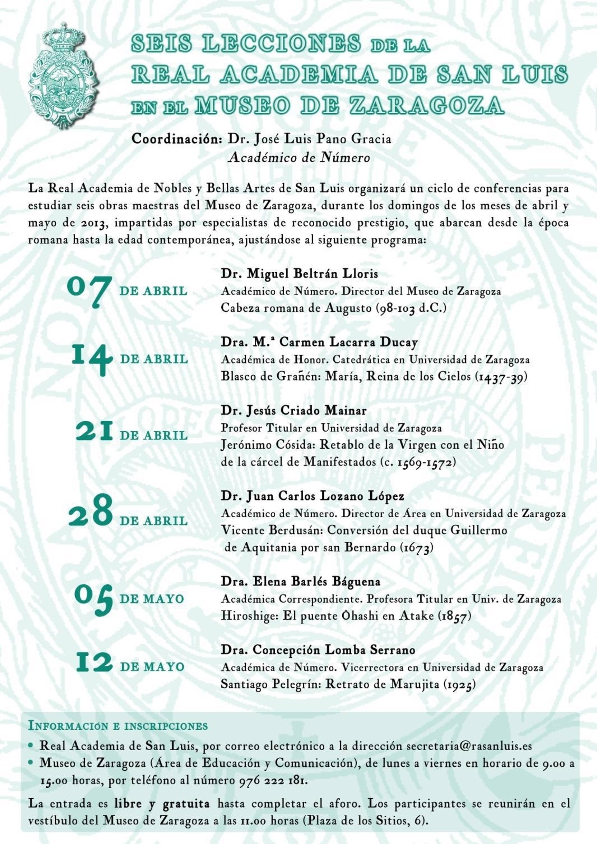 La participación en el ciclo, denominado 'Seis lecciones de la Real Academia de San Luis en el Museo de Zaragoza', es libre y gratuita hasta completar aforo. Las inscripciones se pueden realizar en 'secretaria@rasanluis.es' o en el Museo de Zaragoza (teléfono 976 222 181).
