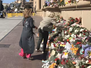 Dos mujeres colocan flores a la virgen del Pilar en la fachada de la basílica - EUROPA PRESS