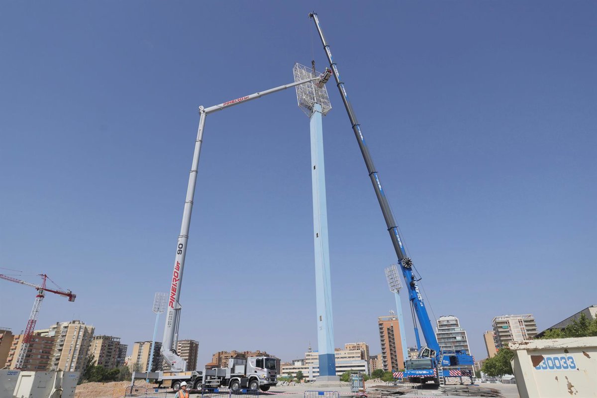 Comienzan los trabajos de retirada y derribo de las cuatro torres de iluminación de la antigua Romareda - DANI MARCOS