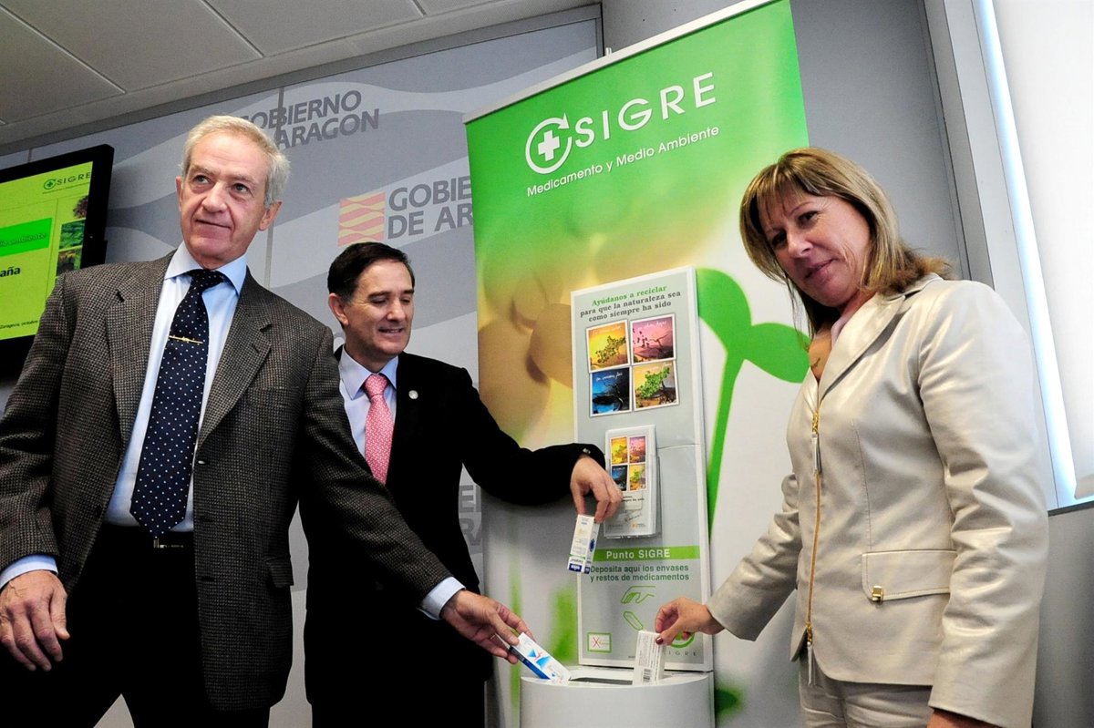 En la presentación de la campaña 'Receta salud + receta medio ambiente' que ha tenido lugar en la capital aragonesa, han estado presentes la gerente del Servicio Aragonés de Salud, Ana Sesé; el director de SIGRE, Juan Carlos Mampaso; y el presidente del Colegio Oficial de Farmacéuticos de Zaragoza, Juan Carlos Gimeno.