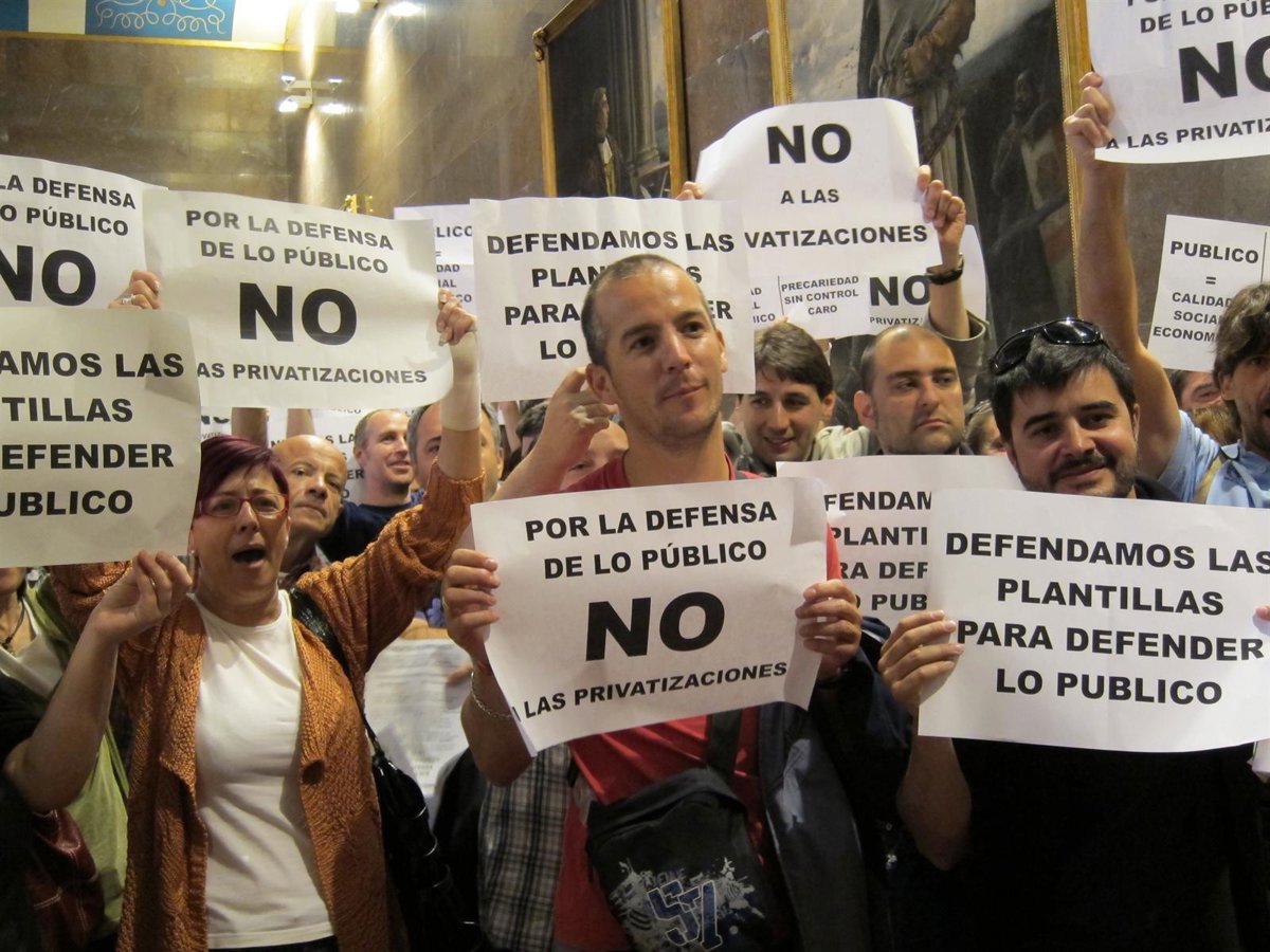 Miembros de CC.OO., UGT, OSTA, CGT, CSL y CSI-F se han instalado en la zona de público del salón de plenos al tiempo que han coreado consignas como 'A los del PAR nadie les va a votar por privatizar', que han seguido pronunciando una vez que han sido desalojados y se han instalado a las puertas del Salón de Plenos.