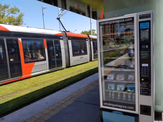 Archivo - Máquina expendedora de mascarillas e hidrogel en una parada del tranvía. - AYUNTAMIENTO DE ZARAGOZA - Archivo