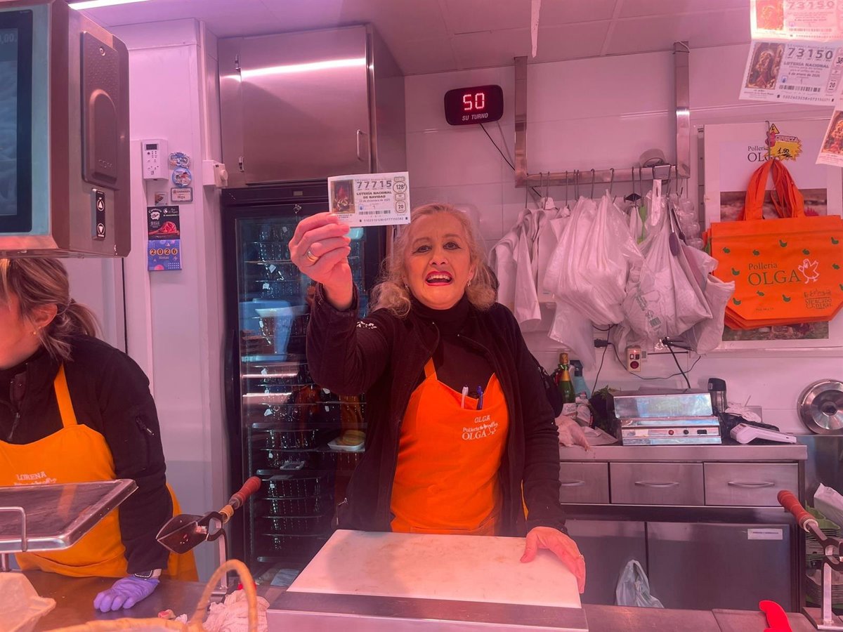 La propietaria de Pollería Olga, Olga Romeo, ha llevado la suerte al Mercado Central este lunes en forma de quinto premio del Sorteo Extraordinario de Navidad 2025. En su establecimiento se han vendido 600 decimos del número 77.715, 12.000 euros que repartirán 3,6 millones de euros entre su clientela.
