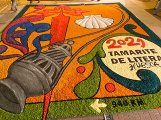 "Es un homenaje al Año Santo Compostelano y al Camino de Santiago, que también recorre Tamarite de Litera", ha contado una de las alfombristas implicadas, María José Colomina, quien ha añadido que la elección de la plaza de España, donde la alfombra permanecerá hasta el domingo, se debe a que "es un sitio bonito y donde la alfombra puede lucir con vistosidad y ser visitada por muchas personas sin que haya problemas de aglomeraciones".