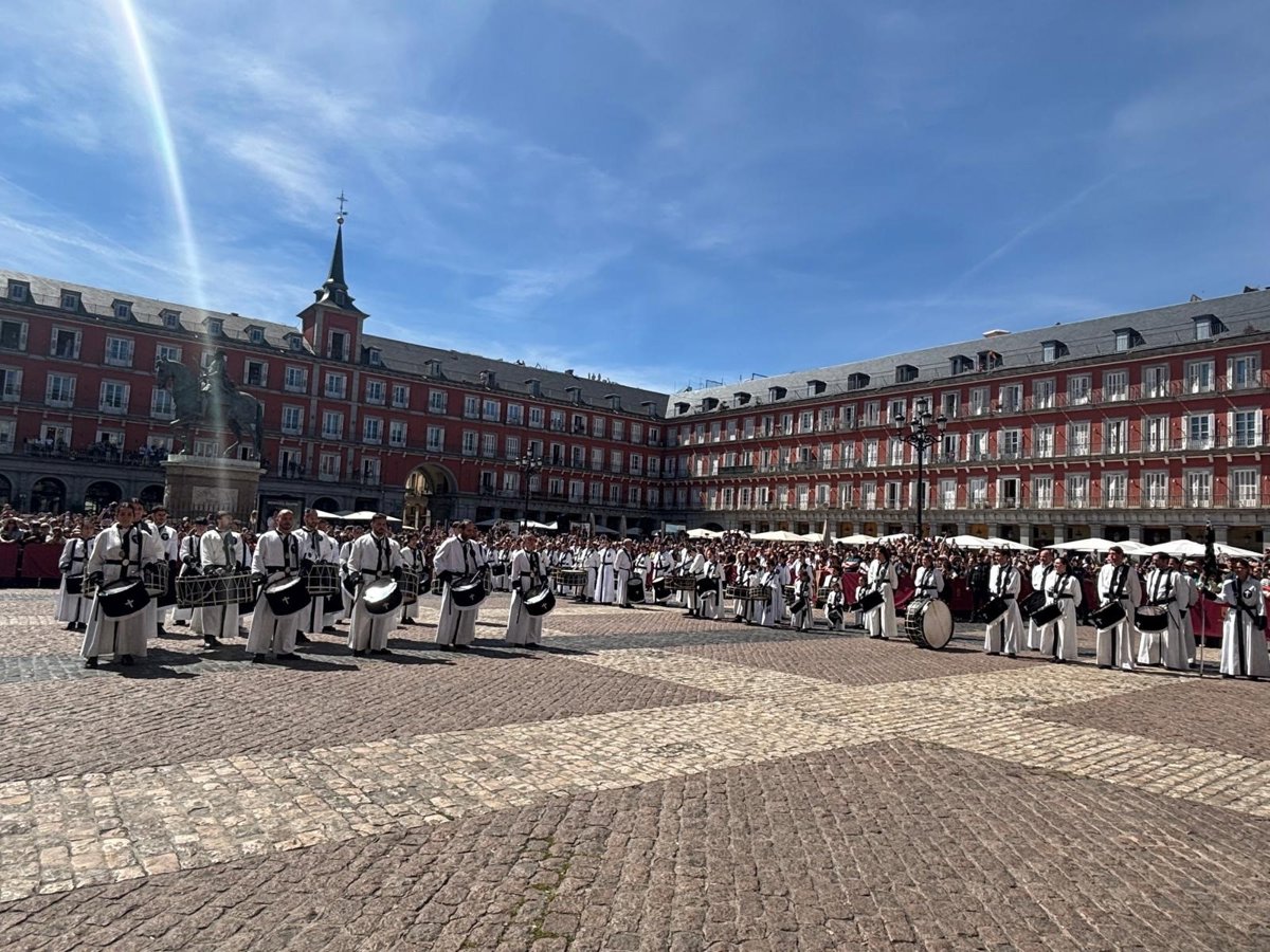 A las 12.00 horas, las secciones de tambores de la cofradía zaragozana han comenzado a retumbar en la plaza Mayor de Madrid.