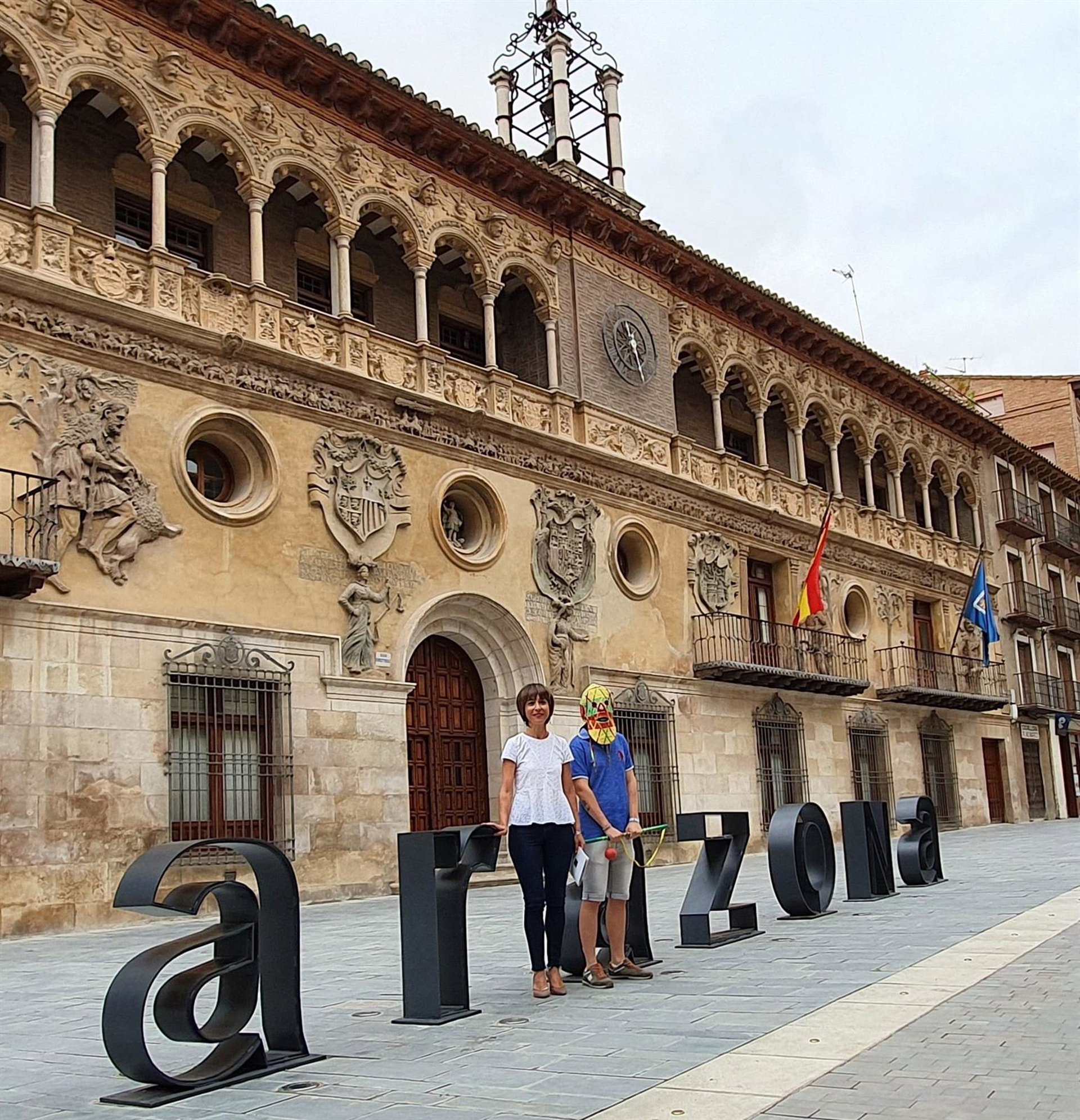 La concejala de Festejos del Ayuntamiento de Tarazona, Eva Calvo, y el Cipotegato 2019, este martes, 20 de agosto, en la presentación del programa de las Fiestas Generales de la localidad. - AYUNTAMIENTO DE TARAZONA