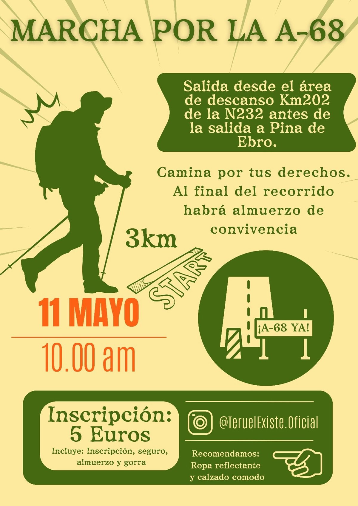 El Movimiento ciudadano Teruel Existe ha convocado una marcha reivindicativa por la A-68, que tendrá lugar el próximo domingo 11 de mayo, en la localidad de Pina de Ebro (Zaragoza). La marcha partirá a las 10.00 horas del área de descanso del Km 202, antes de la salida de Pina de Ebro, para realizar un recorrido de unos 3 kilómetros, en un itinerario corto, fácil muy accesible para todas las personas de cualquier edad.