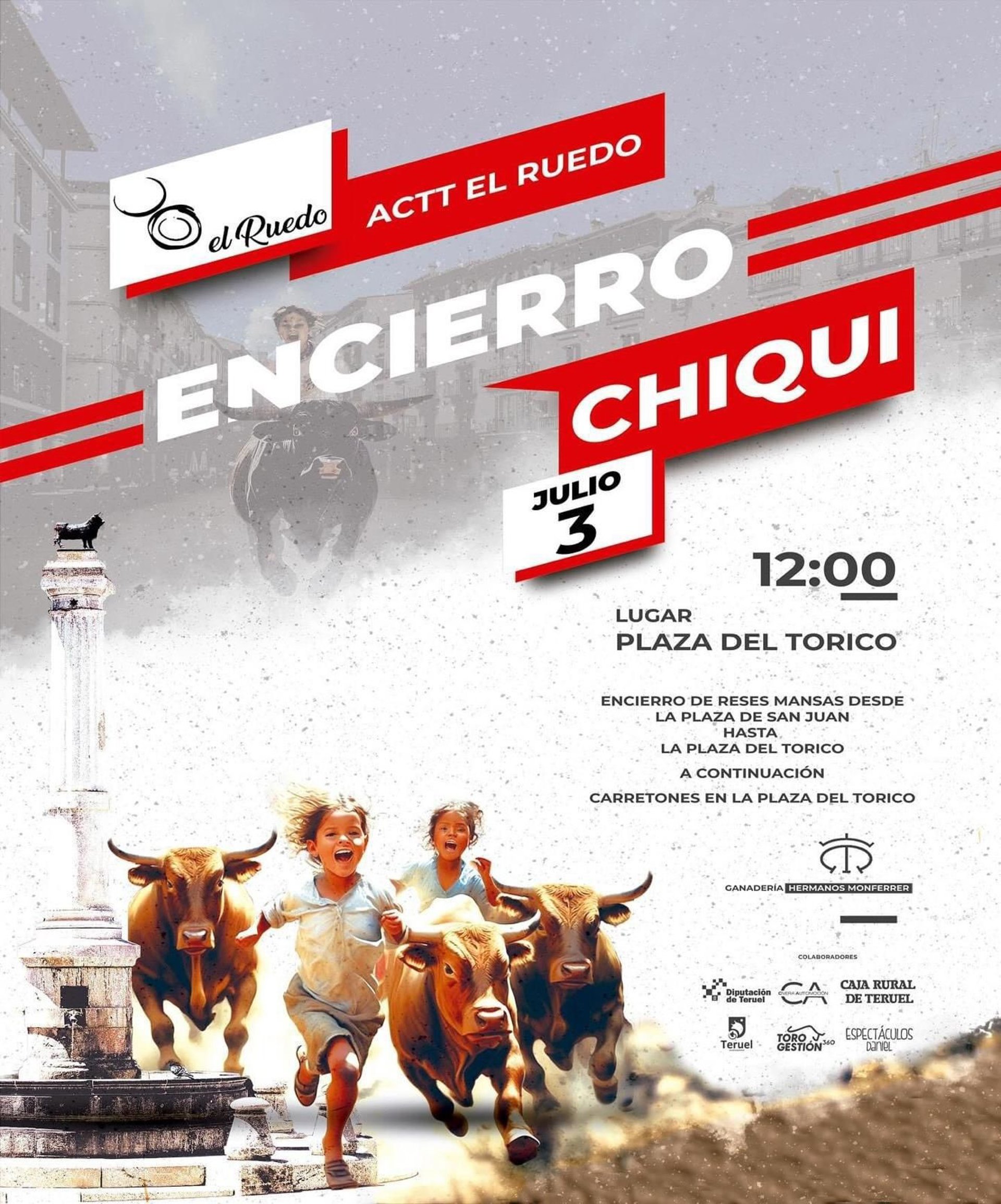 Una cita a la están invitados todos los niños de Teruel en la que se simulará un encierro con reses de raza mansa y berrenda, de entre 6 y 12 meses de edad, que correrán por un pasillo delimitado entre las plazas de San Juan y del Torico. Las reses pertenecen a la ganadería de los Hermanos Monferrer, de Formiche Alto, que además de criar ganado bravo también cuentan con ganado de raza mansa.