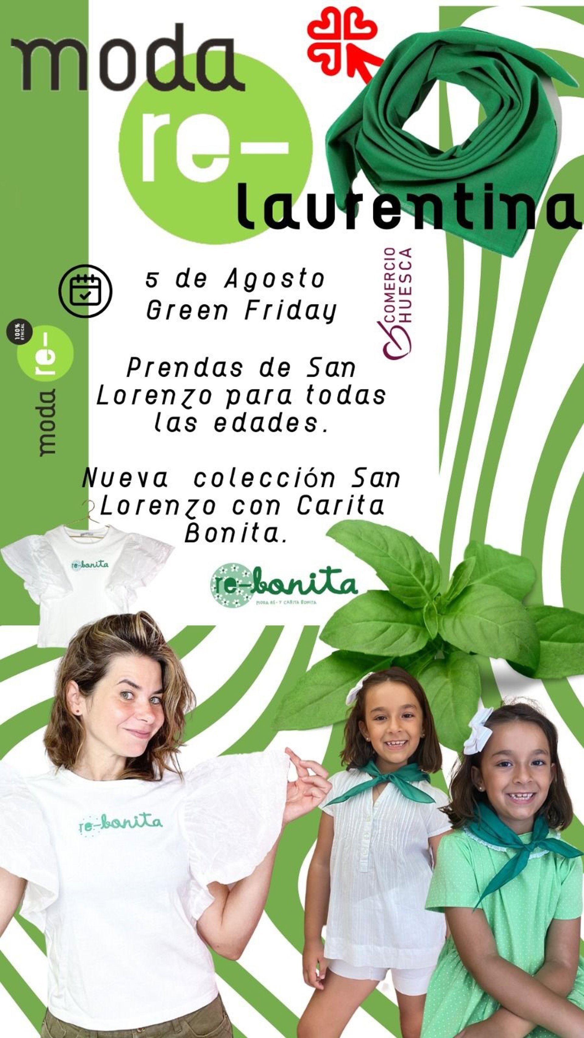 Con motivo de este acto, Moda Re- expondrá una selección de prendas laurentinas en la plaza Navarra, de 10.00 a 23.00 horas, durante la jornada del Green Friday, junto a otras tiendas de moda textil que sacarán a la calle sus artículos con los colores blanco y verde para ayudar a preparar los atuendos de las fiestas locales de San Lorenzo.