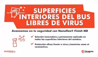El tratamiento permanente de las superficies interiores de los autobuses urbanos de Zaragoza con un producto que proporciona protección contra virus, hongos y bacterias, Nanoflex Finish MR, ya se ha completado en toda la flota. La aplicación de esta sustancia impide que los microorganismos se adhieran a superficies, de modo que éstas permanecen esterilizadas por largo tiempo.