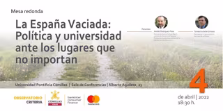 El Observatorio Criteria de la Universidad Pontificia Comillas ha organizado este lunes una mesa redonda con el título 'La España vaciada: Política y Universidad ante los lugares que no importan', en la que entablarán un diálogo el profesor de geografía económica de la London School of Economics Andrés Rodriguez-Pose, que también es director del Centro Cañada Blanch y la Cátedra Princesa de Asturias, y el diputado en el Congreso por Teruel Existe, Tomás Guitarte. El movimiento ciudadano es una de las plataformas de España Vaciada.