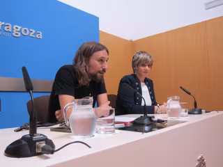 El concejal de Vivienda y Deporte del Ayuntamiento de Zaragoza, Pablo Híjar, y la directora general de Vivienda del Gobierno de Aragón, Mayte Andreu han expuesto los datos del primer semestre de este programa desde su puesta en marcha.