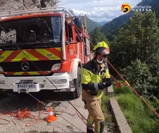 Agente de bomberos de la DPH en la pista forestal de Eriste participando en el rescate del microbús accidentado. - DPH.
