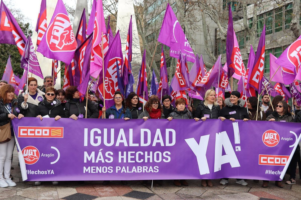 UGT y Comisiones Obreras (CCOO) han organizado este martes una concentración en Zaragoza para reivindicar "más hechos" que logren "igualdad real" de género. En este contexto, han aprovechado para hacer un llamamiento a la participación en las movilizaciones convocadas para este domingo, 8 de marzo, con motivo del Día Internacional de la Mujer.
