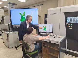 A continuación, se han explicado las principales características del equipo de tomografía computarizada industrial --Zeiss Metrotom 800 225 kV HR--, que mediante rayos X es capaz de capturar imágenes detalladas del interior de objetos sin necesidad de desmontarlos o destruirlos, y fusionarlas para generar una reconstrucción 3D completa.