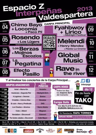 El Espacio Z-Interpeñas- Valdespartera ofrece numerosos conciertos y actuaciones musicales distribuidas en cuatro carpas, la carpa Principal, carpa House, carpa del peñista y carpa de grupos aragoneses, desde este viernes 4 de octubre hasta el próximo día 12 de octubre.
