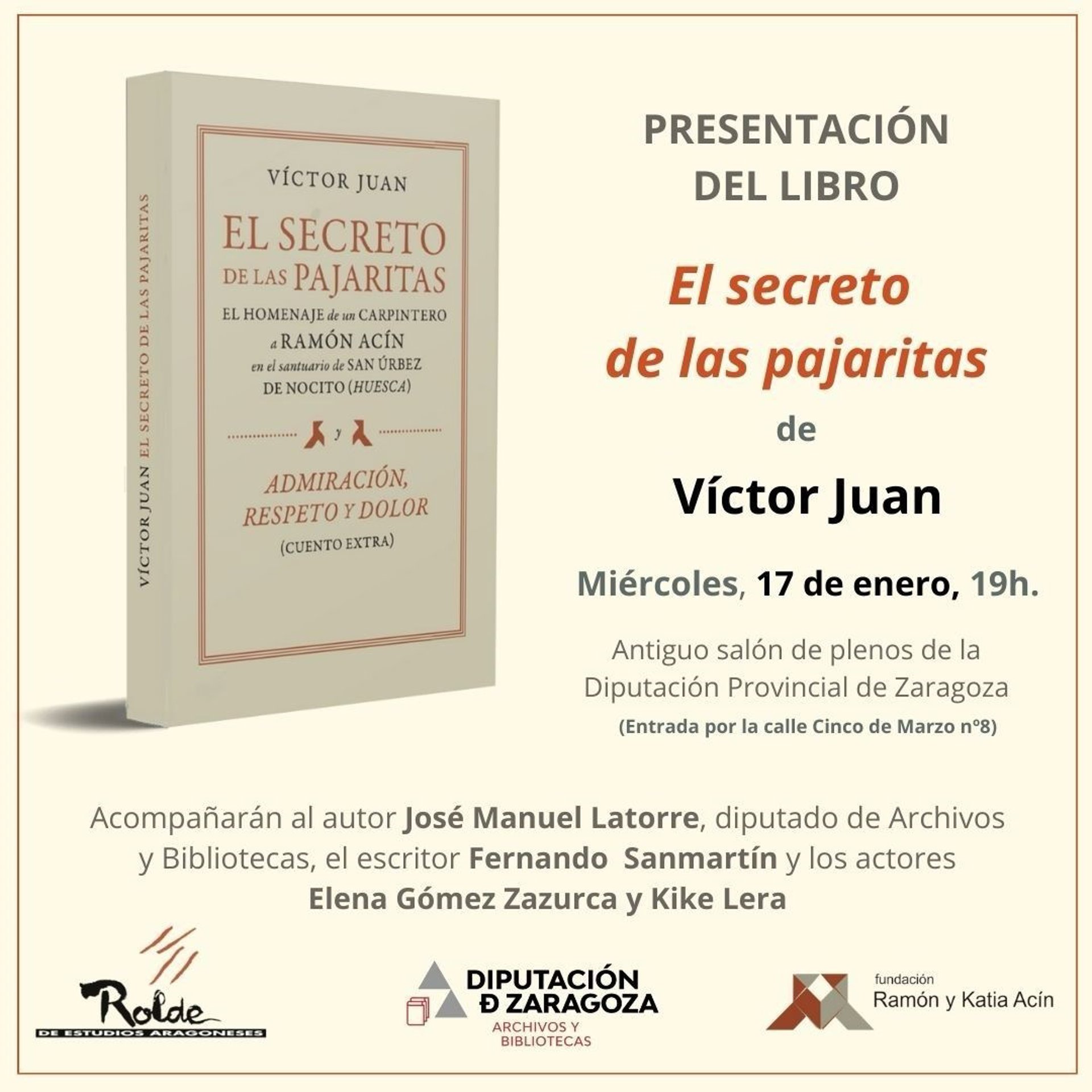 La Diputación de Zaragoza (DPZ) acoge este miércoles, 17 de enero, la presentación del último libro de Víctor Juan, "El secreto de las pajaritas", en el antiguo salón de plenos de la institución provincial, a las 19.00 horas. La entrada libre hasta completar el aforo.