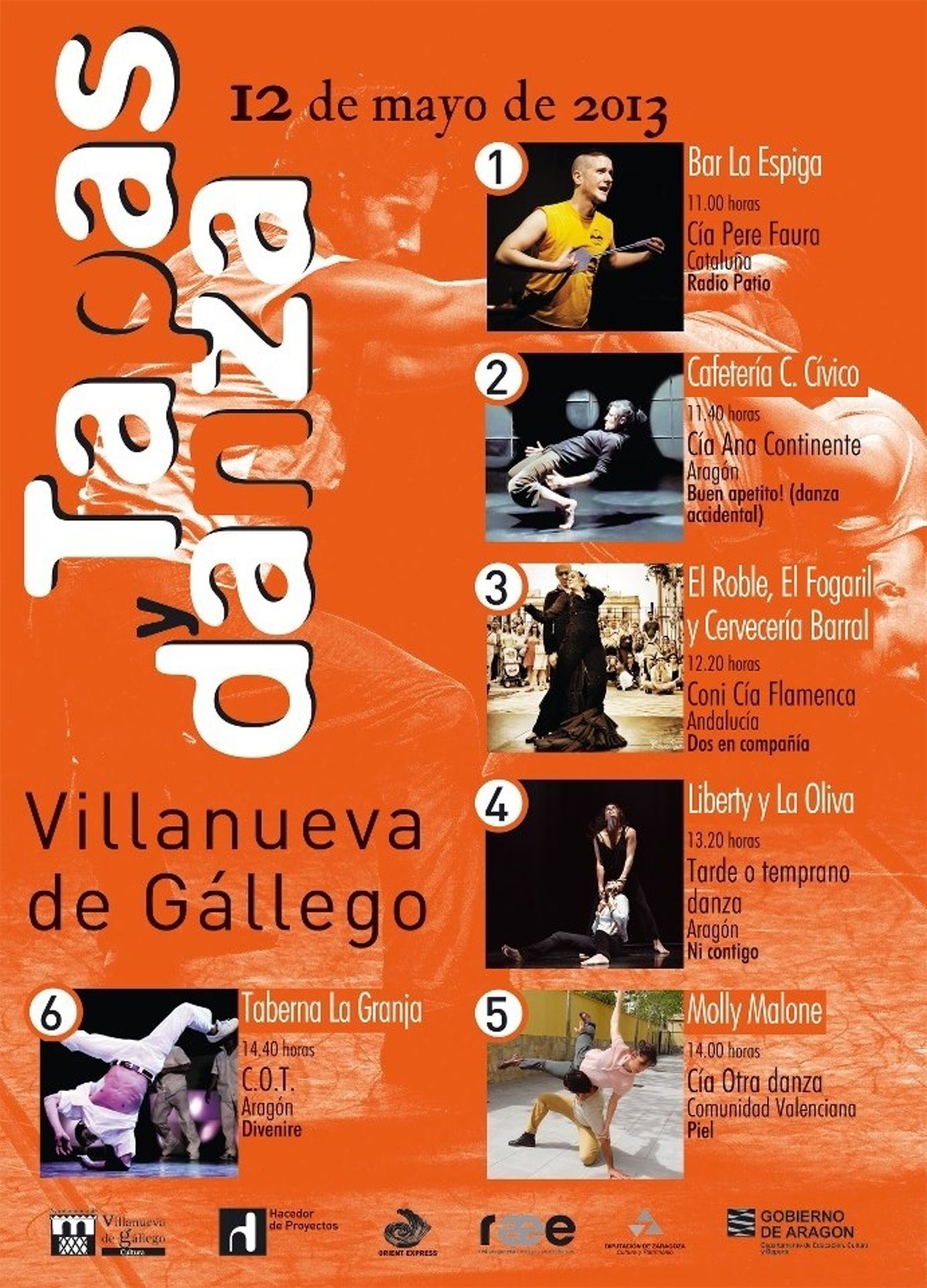 Este recorrido de tapas estará amenizado por las actuaciones de danza de las compañías Pere Faura (Cataluña), Coni Compañía Flamenca (Andalucía), Otra Danza (Comunidad Valenciana) y las aragonesas Circle of Trust, Ana Continente y Tarde o Temprano Danza .