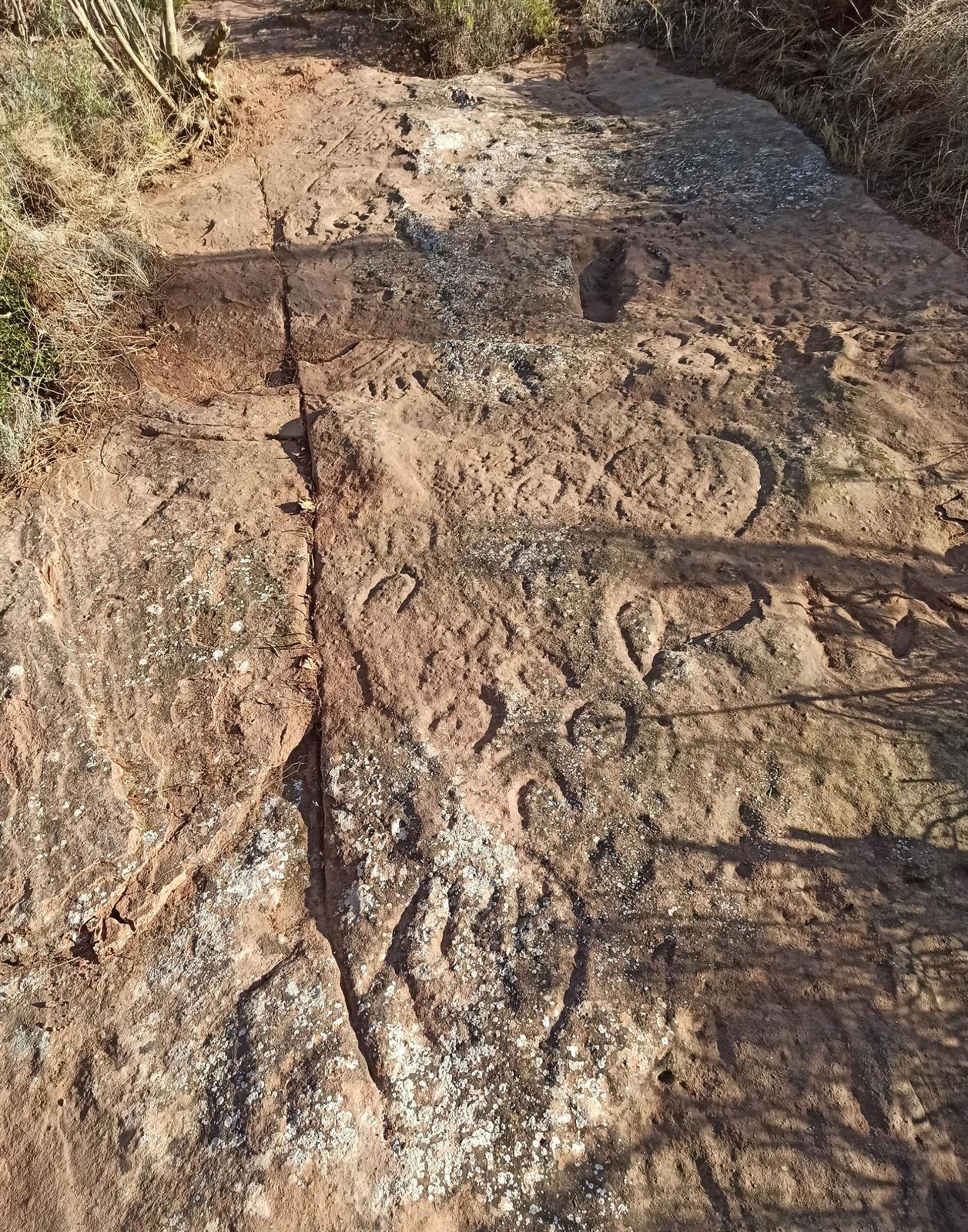 Se aprecian herraduras, círculos, cruciformes, letras, pectiniformes o surcos. Los grabados se realizaron con dos técnicas principales: grabados realizados por abrasión y grabados realizados por picado. A falta de una investigación más rigurosa, el origen de estos grabados arranca en un momento de la protohistoria hasta época contemporánea, cuando se realizaron los últimos grabados.